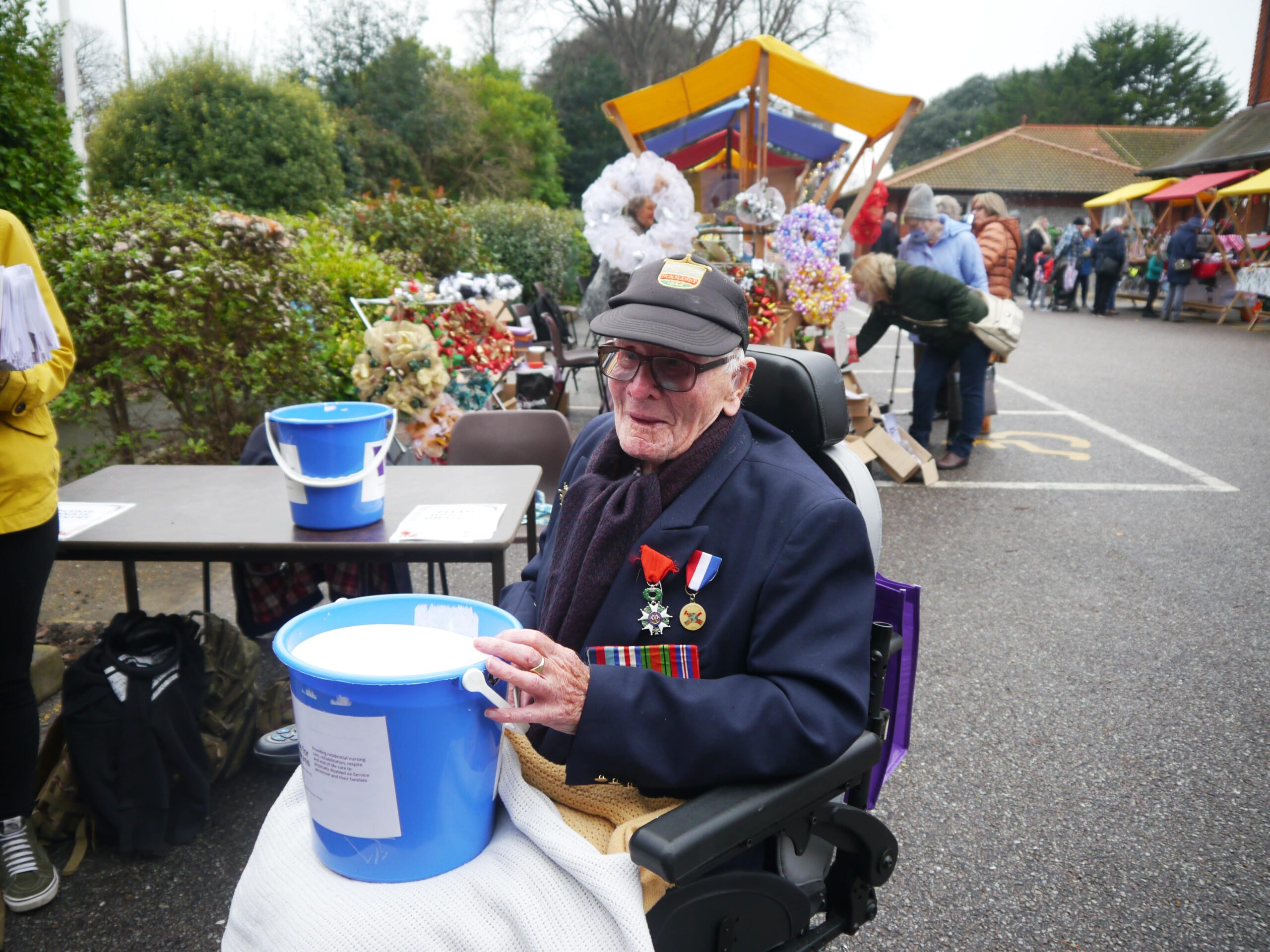 98-year-old WWII Veteran Len Gibbon helped collect donations at the entrance